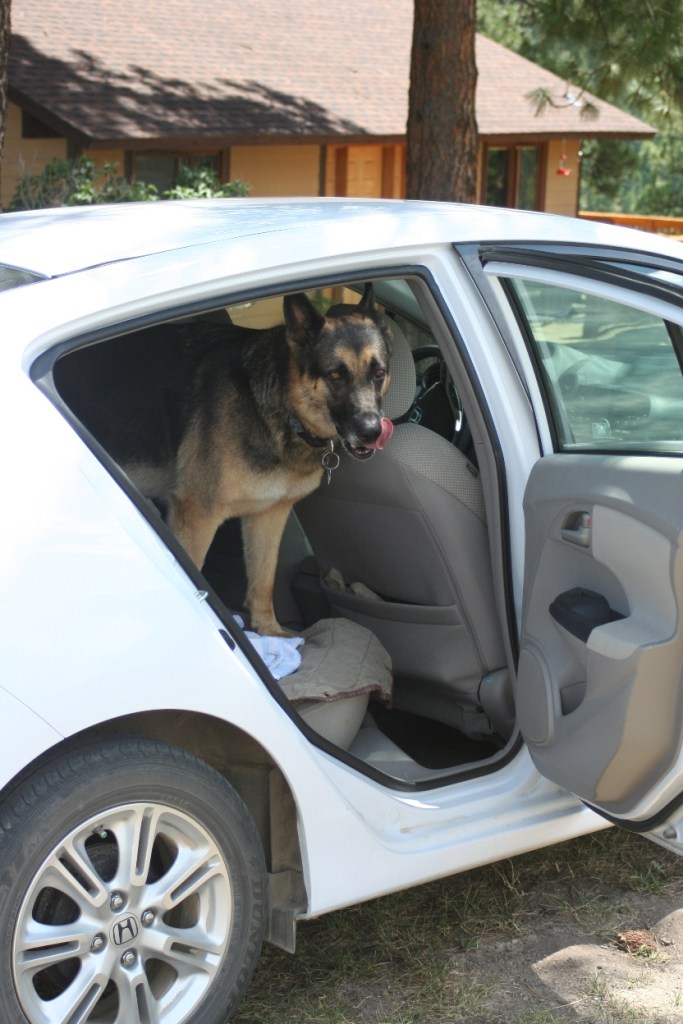 The chipmunk was driving Wylie crazy while Deni put the car’s backseats down in preparation for transporting some boxes. Taunting him, chattering nonstop, and darting around the yard. It ran under the car. Wylie ran around and around the car, fixated on the annoying rodent. Deni stepped around the dog, adjusting the seats through the car’s open doors. The crafty chipmunk stayed under the car, just out of paw’s reach. Then Wylie had an idea. Jumping into the backseat of the car, Wylie paced, peering intently out each door. He had figured out that, if that darned racing-striped rat didn’t see him, it would feel safe enough to leave the shelter of the car — and Wylie would be ready when it did!