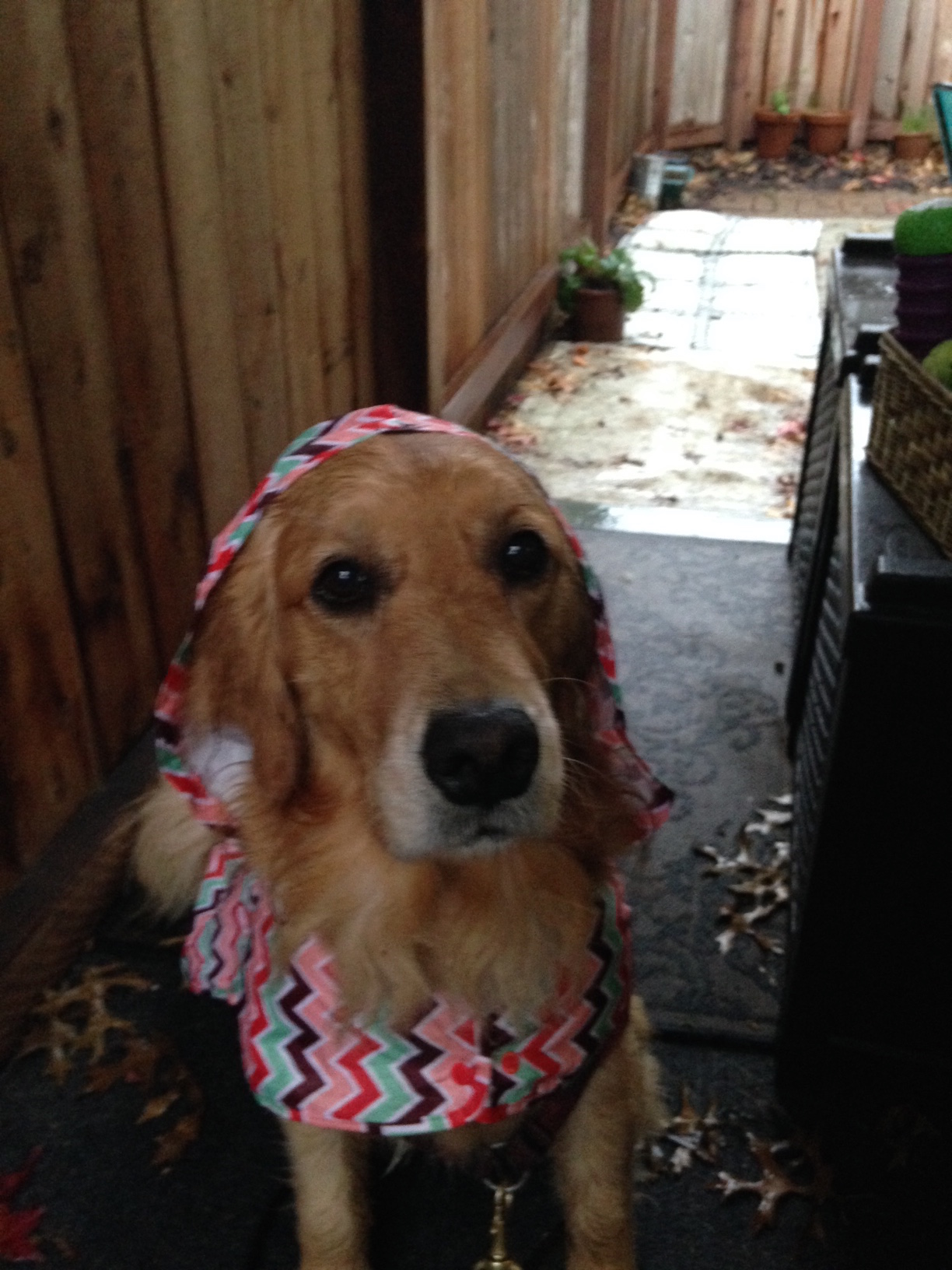 Lest anyone think that I am one of those silly people who dresses her dogs in clothing all the time, I’m not. I got raincoats for the girls, plus a spare for Koala’s visits (and Dora’s) because I was tired of having wet dogs lying around all the time. Jana’s coat took hours to dry completely, and both girls were cold and uncomfortable when they were wet after a walk. Now, Koala’s gone home after a no-rain visit, so Cali has three raincoats to choose from.