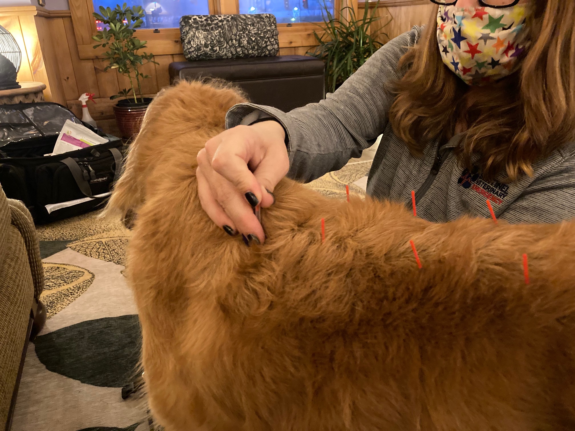Acupuncture. Cali gets needled in her back. Both times, one muscle twitched strongly several times when the needles went in. This is apparently a sign that the muscle is releasing tension.
