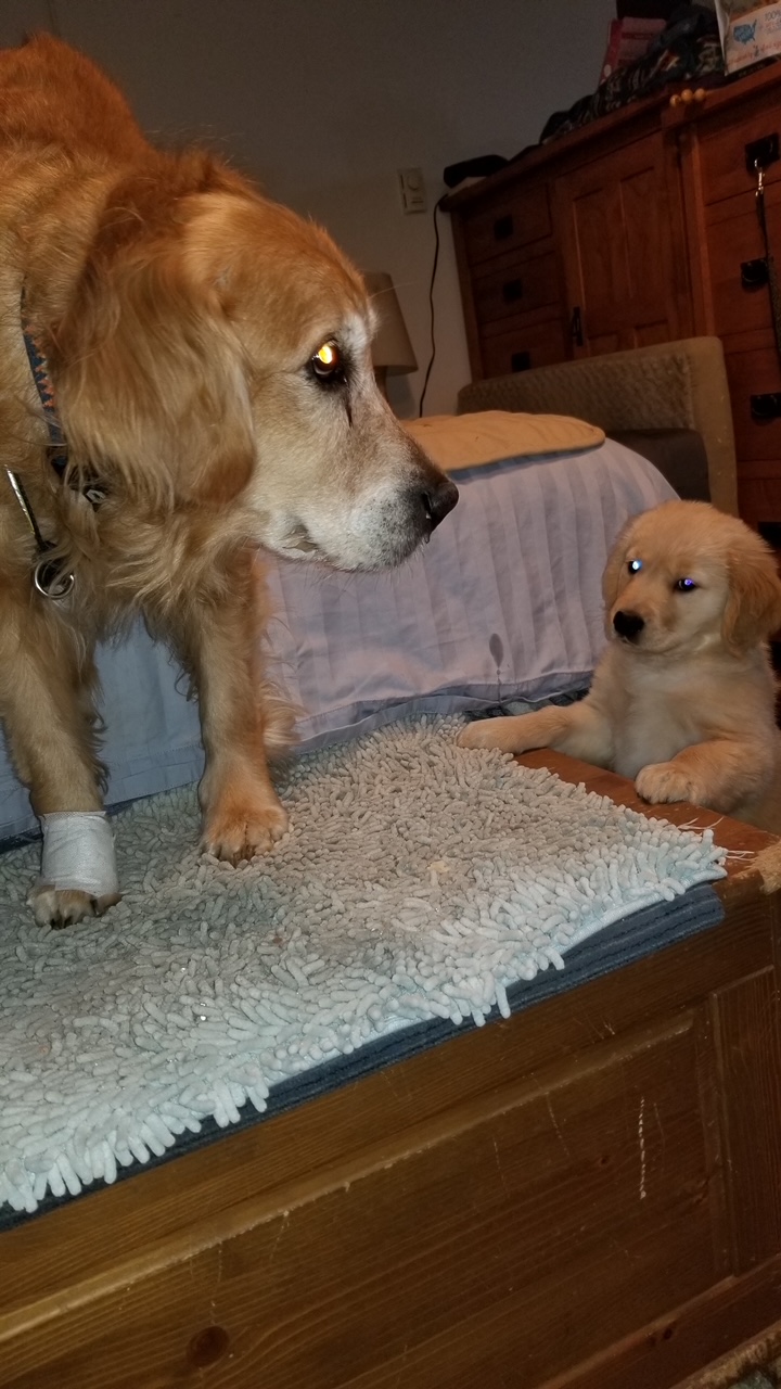 9-year-old Cali meets 10-week-old Orly. Both are golden retrievers.Cali cannot believe her run of bad luck.
