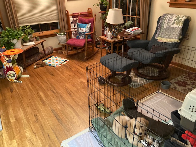A living room with an ex pen, a chair, and no sofaThen her mom left town for almost three weeks! Imagine! OK, well, she got to stay home with a great dog sitter, and Deni showed up after a couple of weeks, but still.