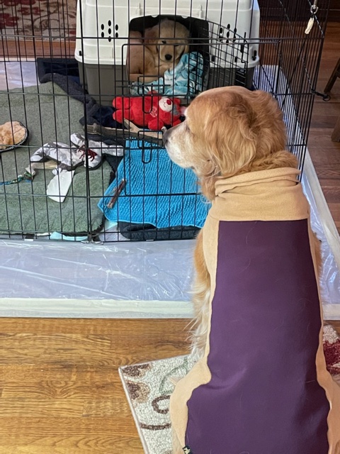 Golden Cali, wearing a purple sweater, stares at the ex pen and its occupant, 10-week-old golden puppy Orly