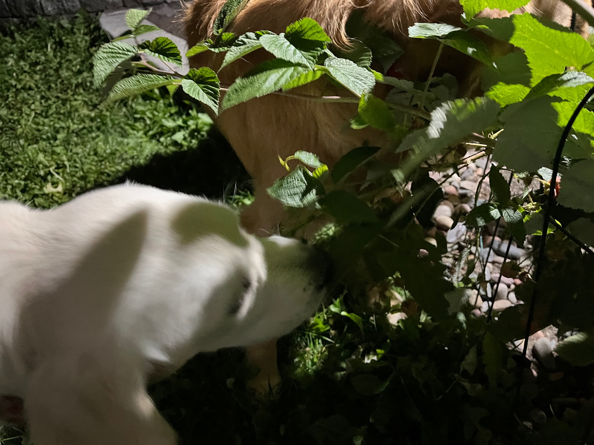 White golden retriever Dotty pokes her nose into deep green raspberry leavesWhen not searching for berries — and the occasional fallen apple from the neighbors’ tree — Dotty is energetically pouncing on every floating leaf and fallen stick, which makes her play time in the yard, and even more so, our walks … interesting.