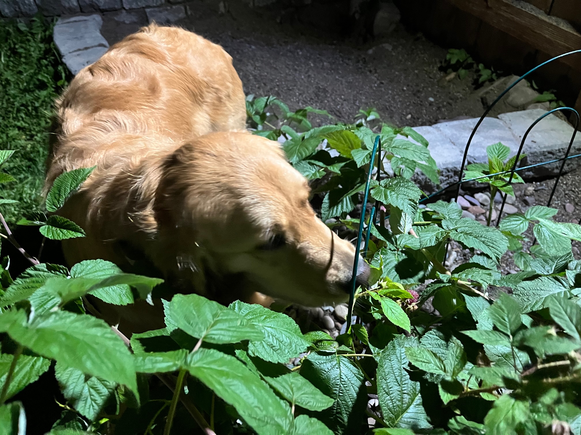 Golden retriever Orly noses among bright green raspberry leaves, sniffing out berriesSummer is winding down here in Missoula.