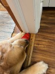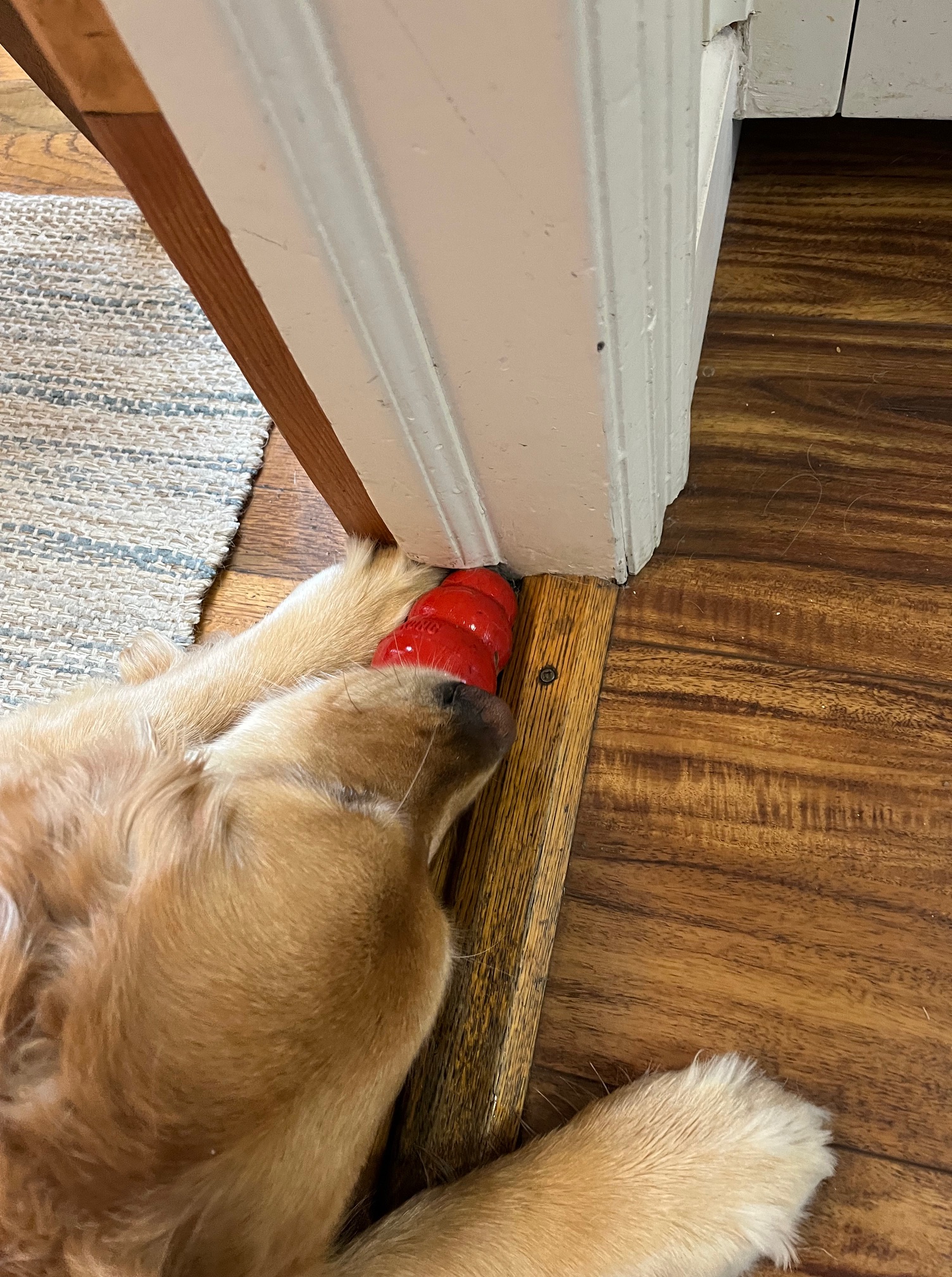As the accompanying photos show, Orly continues the tradition; she recently used a door frame to hold her Kong still. That a dog like Orly would apply her intelligence and any handy object (a tool) to help her obtain food seems obvious; she is a golden retriever, after all.