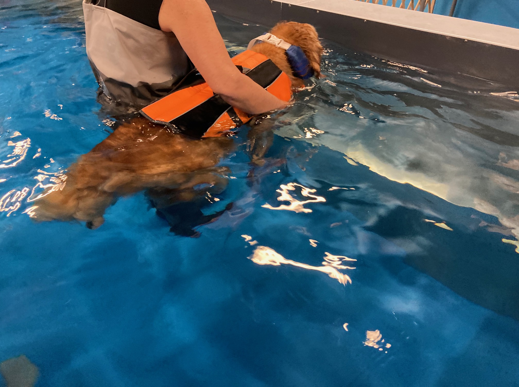 Montana Water Dogs, right here in Missoula, offers swim therapy (hydrotherapy). The owner, Varen, has a really nice setup. She’s got an indoor “infinity pool,” essentially a small, shallow swimming pool. There are steps at one end. The water is about waist deep.