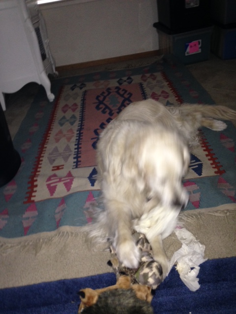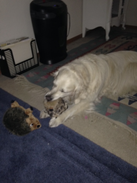 It’s scary to wake up to a dog who cannot stand up. It is also scary to have to figure out how to get a 60-lb. dog outside to pee or into the car when she cannot support her own weight. We really need 30-lb goldens. If she had not recovered quickly, I would have had to make some hard decisions. I was very relieved to see Jana trying to stand, and, slowly, getting her bearings back.