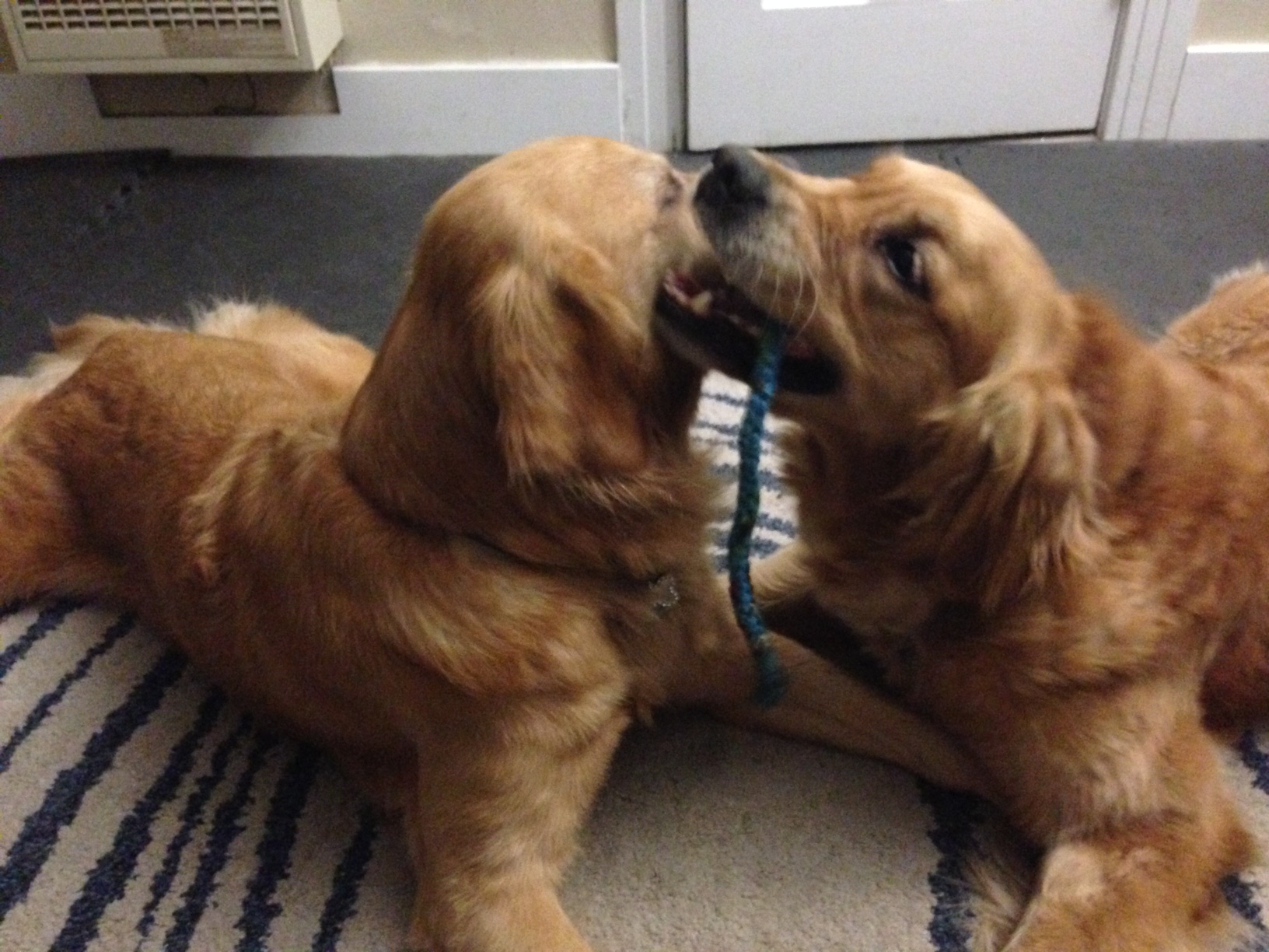 Orly wants, and seems to need, frequent high-energy play. With the dogs in her hiking group, with Spirit, with neighbors’ dogs. (Fortunately, we are surrounded by puppies and adolescent dogs of all sizes and types.) I’m trying to get her together with her buddies often, but she’s at that age where there are simply never enough playmates and activities to truly tire her out.
