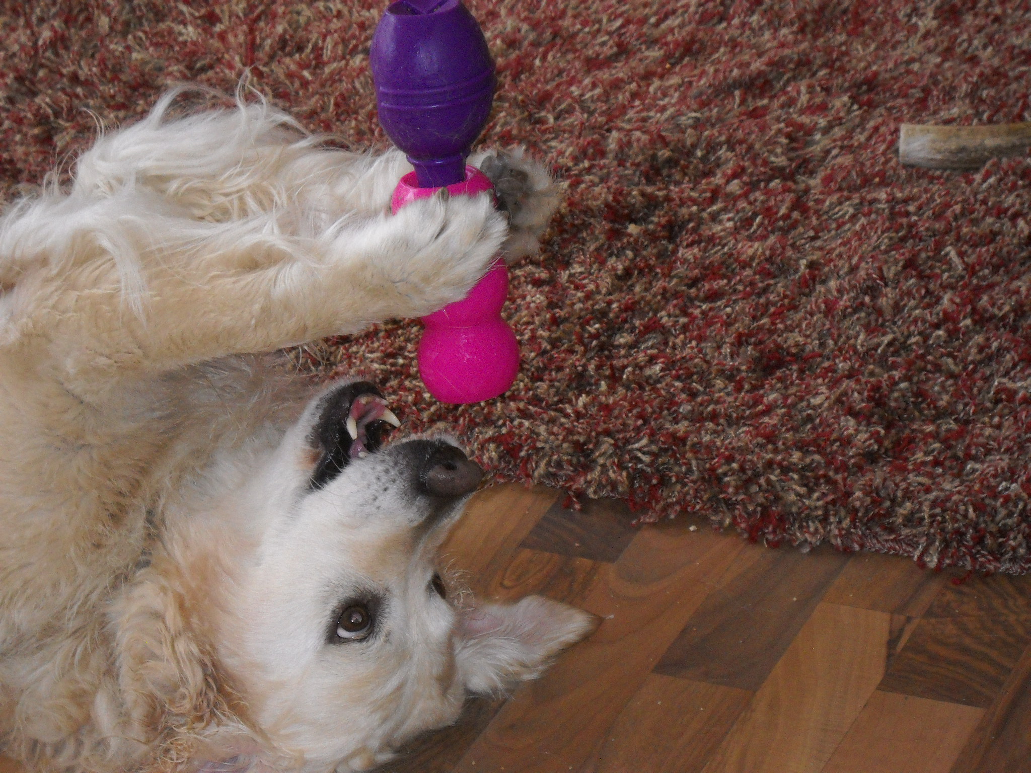 All grown up and still thinking about how to get food out of her toys …But even where their thoughts might meander to some of the same topics we’d think about, I bet that dogs do it very differently. While dogs are often taught to understand many, many words, I doubt that dogs actually think in words. Alexandra Horowitz, in Inside of a Dog, suggests that dogs think in smells and maybe in pictures. That makes sense when you consider how powerful their experience of scent is.