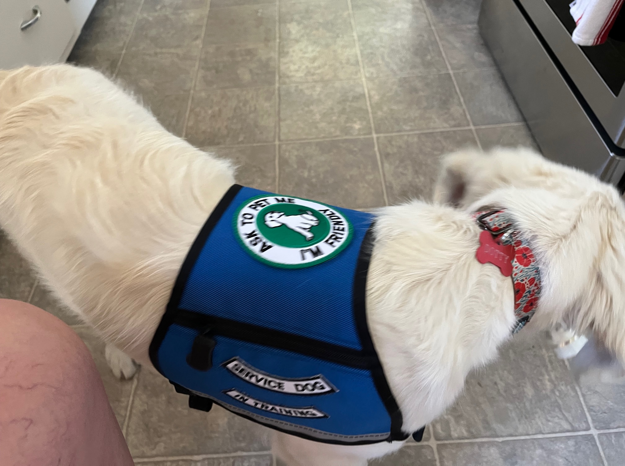 The idea is to get her used to everything, and anything. So that she won’t be surprised by people, carts, or whatever else pops up when she’s out and about. It’s a kind of “desensitization” training that, I hope, will build up her confidence in preparation for when she, as service dogs do, goes into new places and experiences unexpected things.