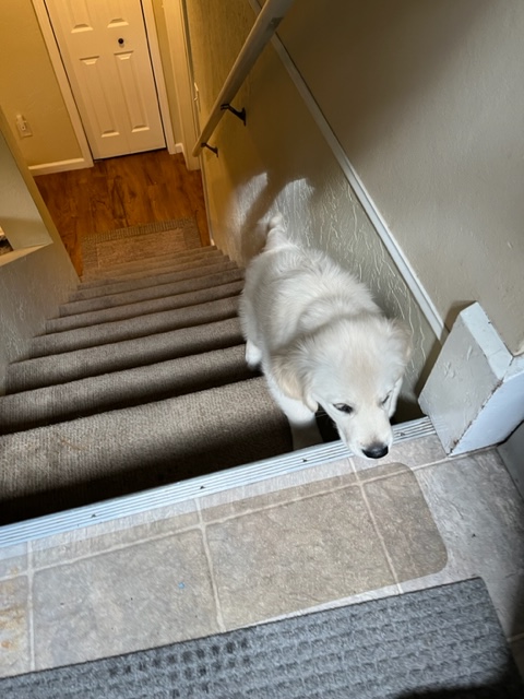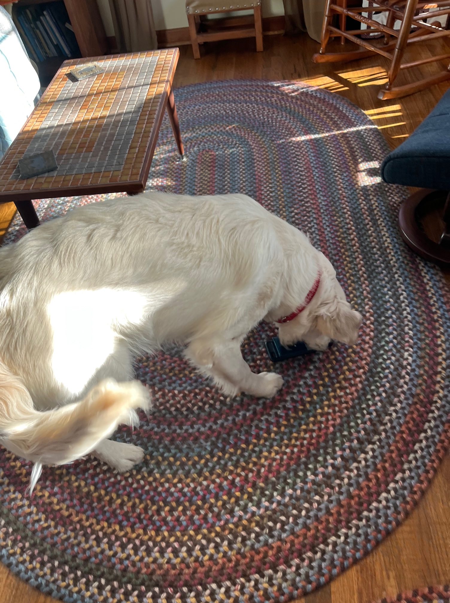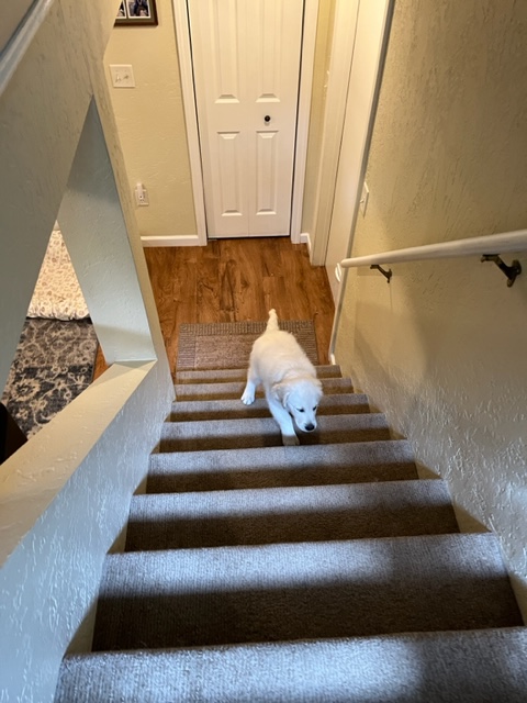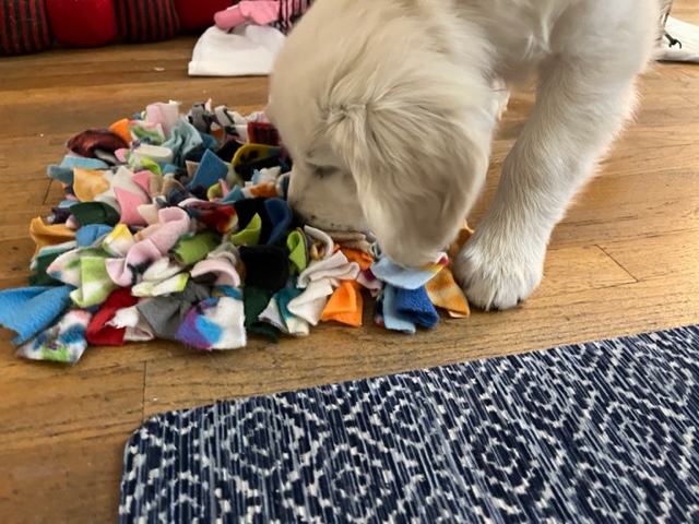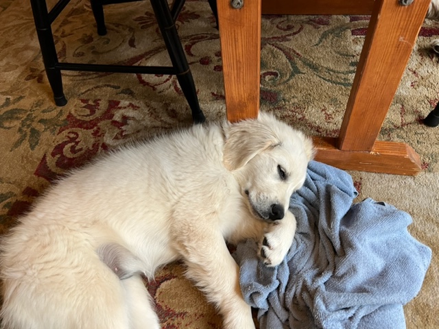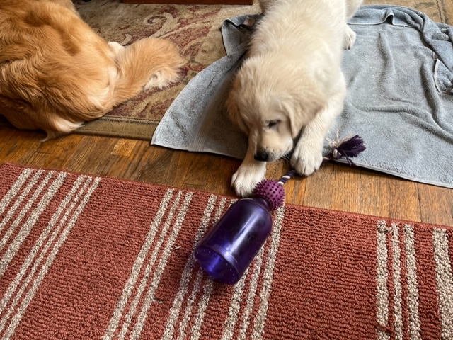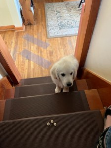 To be fair, she’s very typical of golden retriever puppies; she’s just more than most puppies I’ve worked with: More energetic; more aware of every little sound or movement in her environment; more excited to see people she knows, people she doesn’t know, dogs, cats, squirrels, deer…