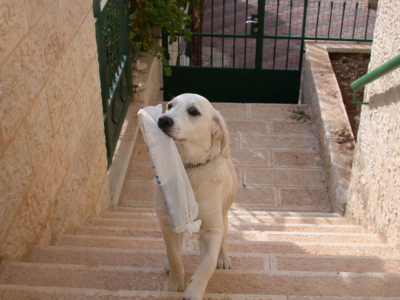 The newspaper was still bigger than Cali the first time she grabbed it and dashed off ahead of Jana. Reined in by a too-short leash, Cali was soon overtaken by Jana. Jana looked at her in annoyance, then reached over and snatched “her” newspaper back.